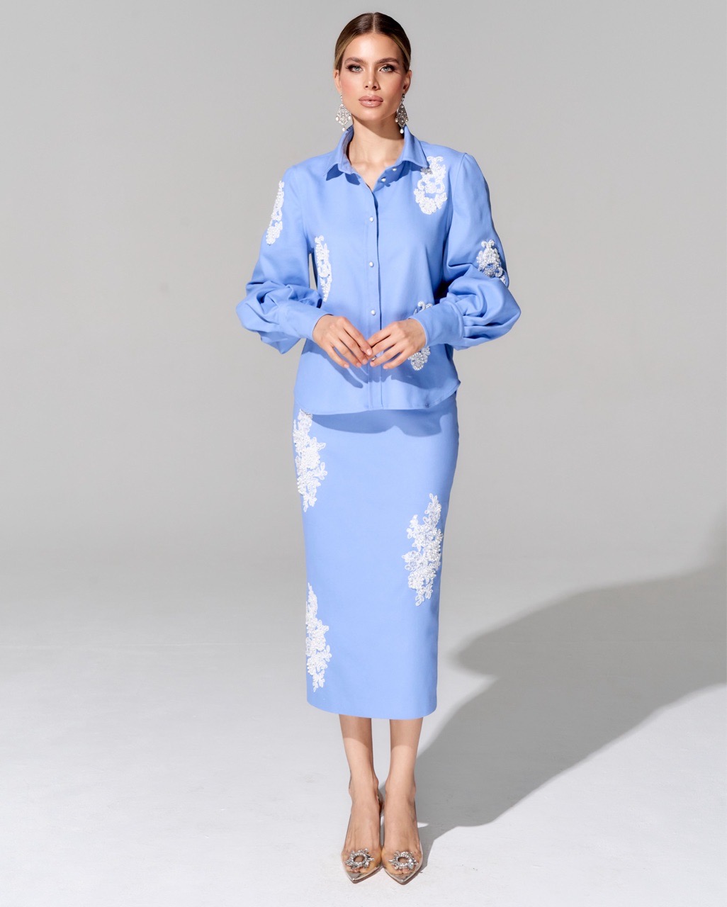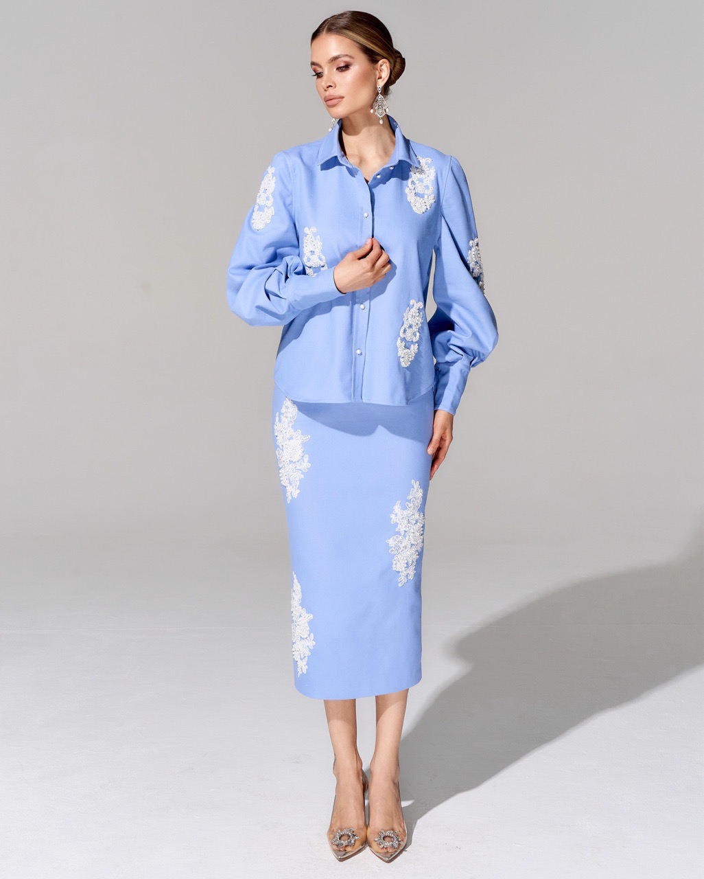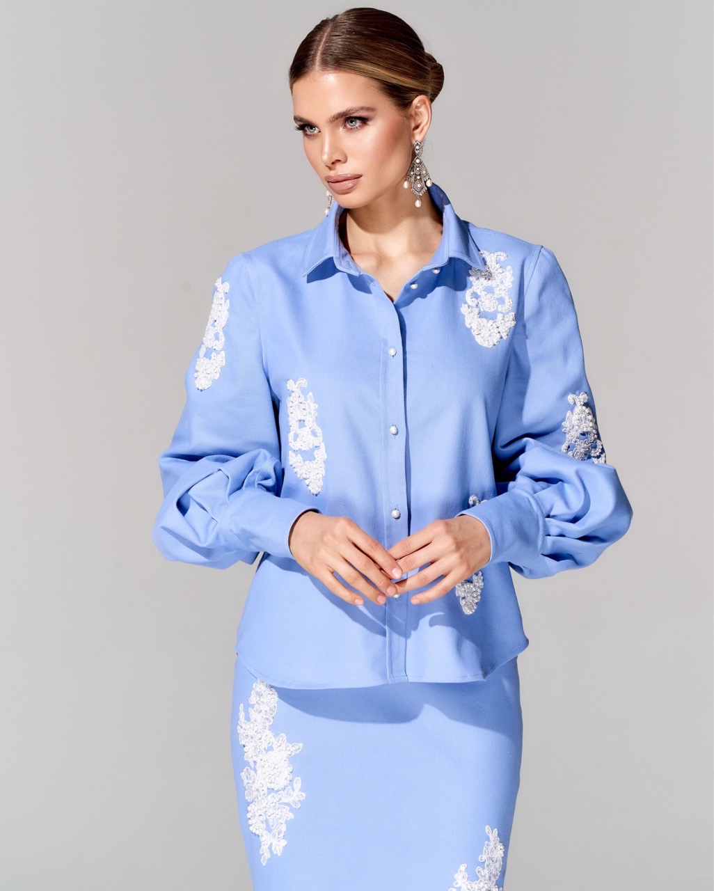 Блуза из премиальной джинсовой ткани с вышивкой ручной работы