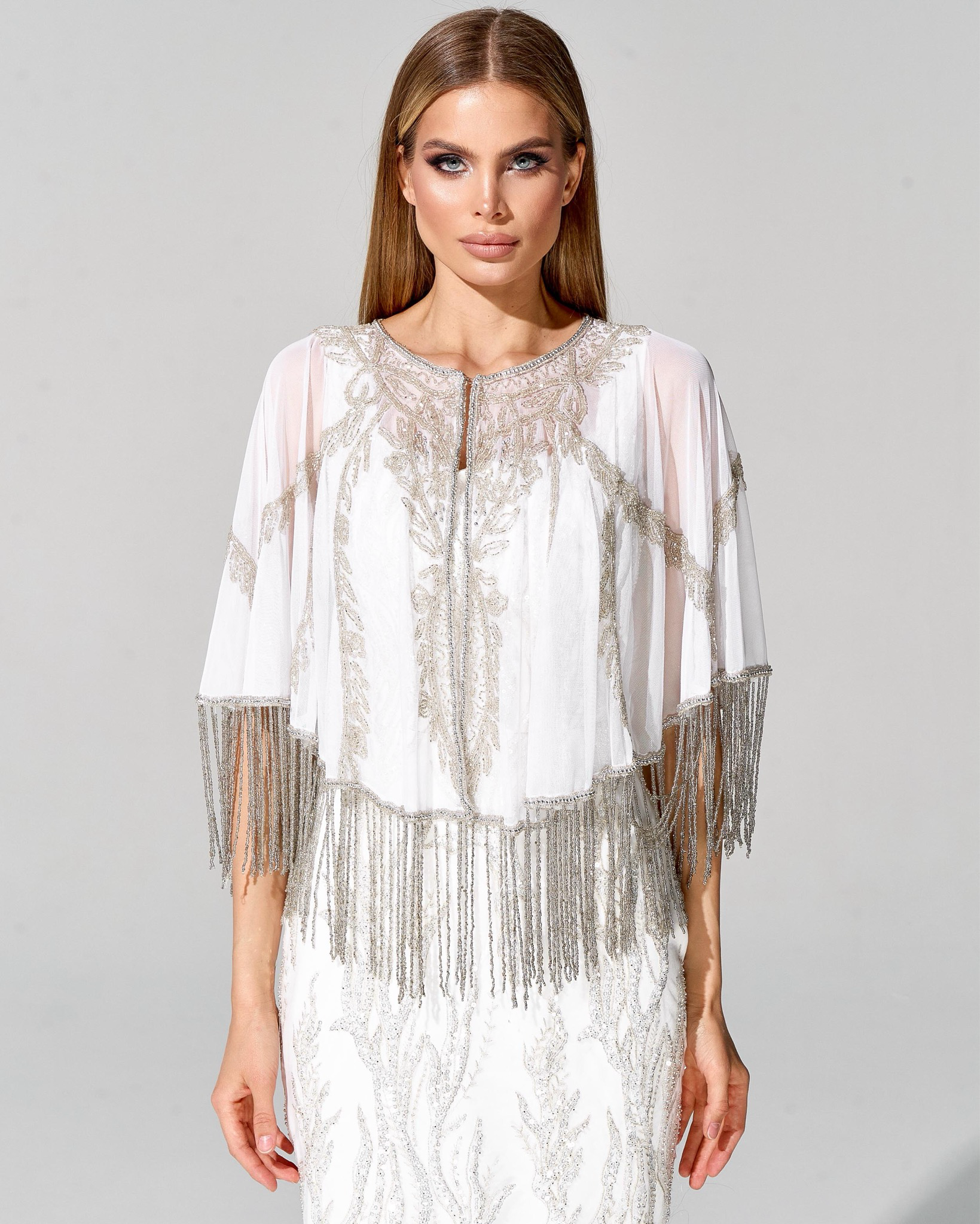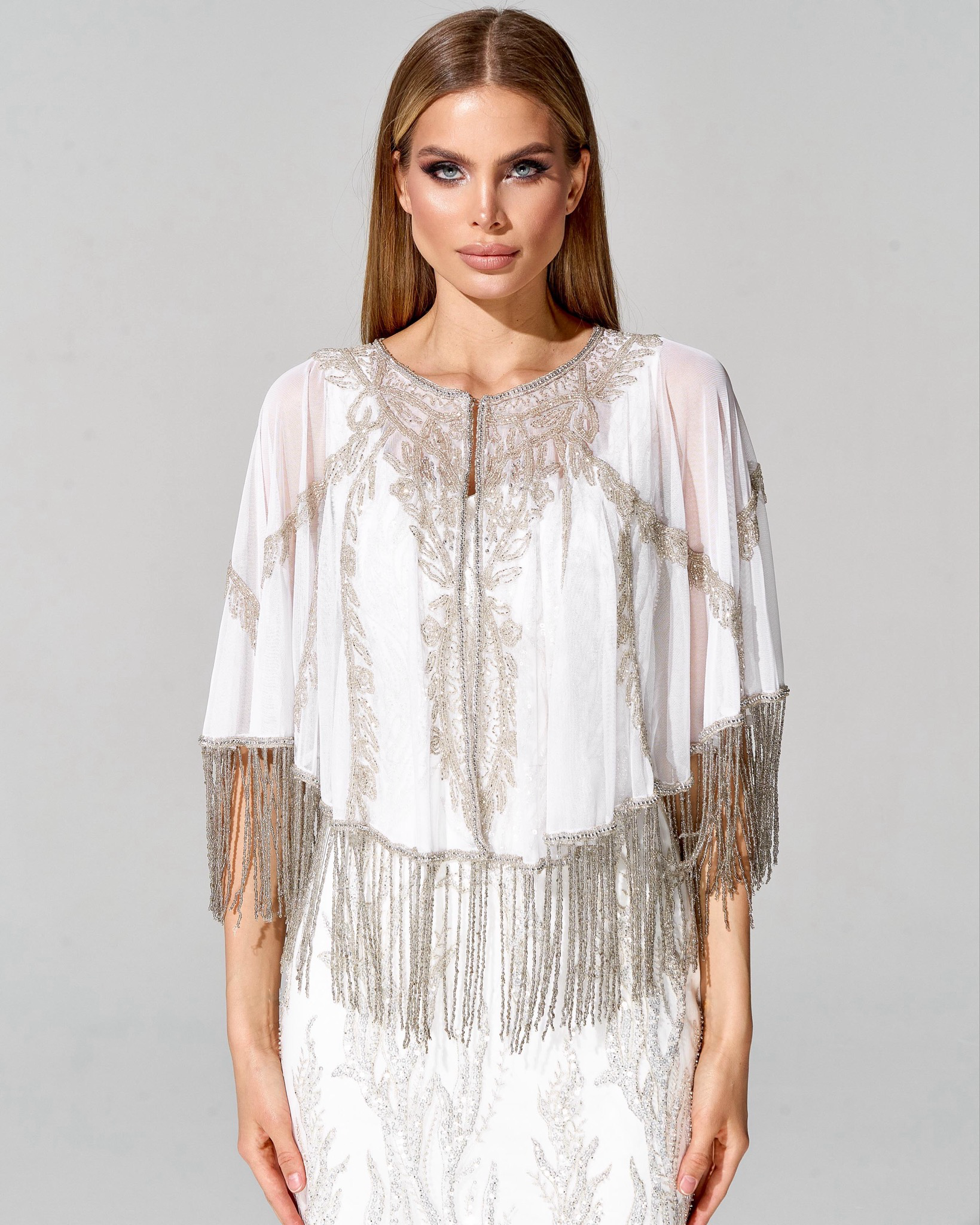 Укороченный кейп из французской сетки, отделка бисером и кристаллами Swarovski не оставит Вас и Ваш образ без внимания и восхищения. Изделие станет идеальным завершением любого образа и добавит эксклюзивности.