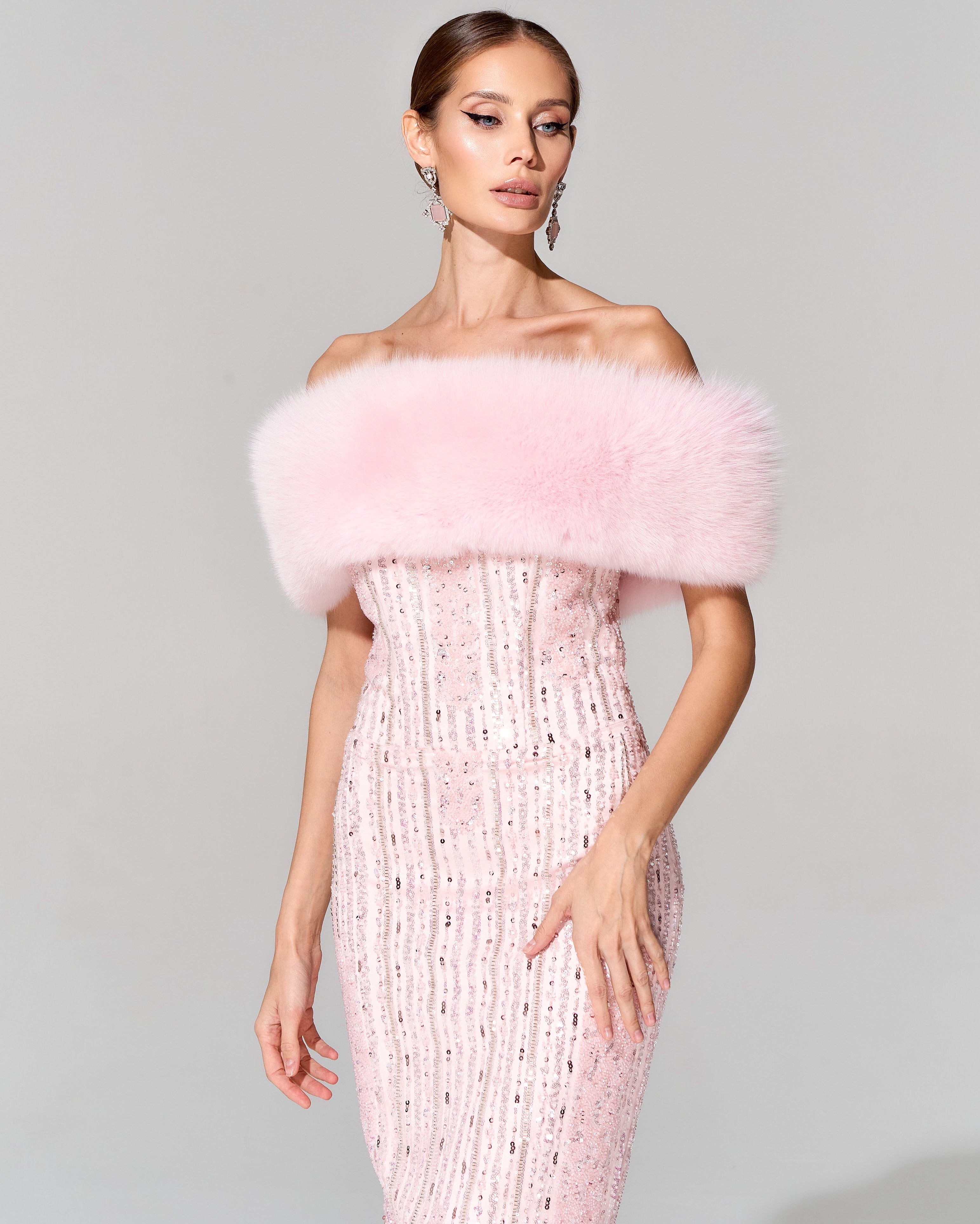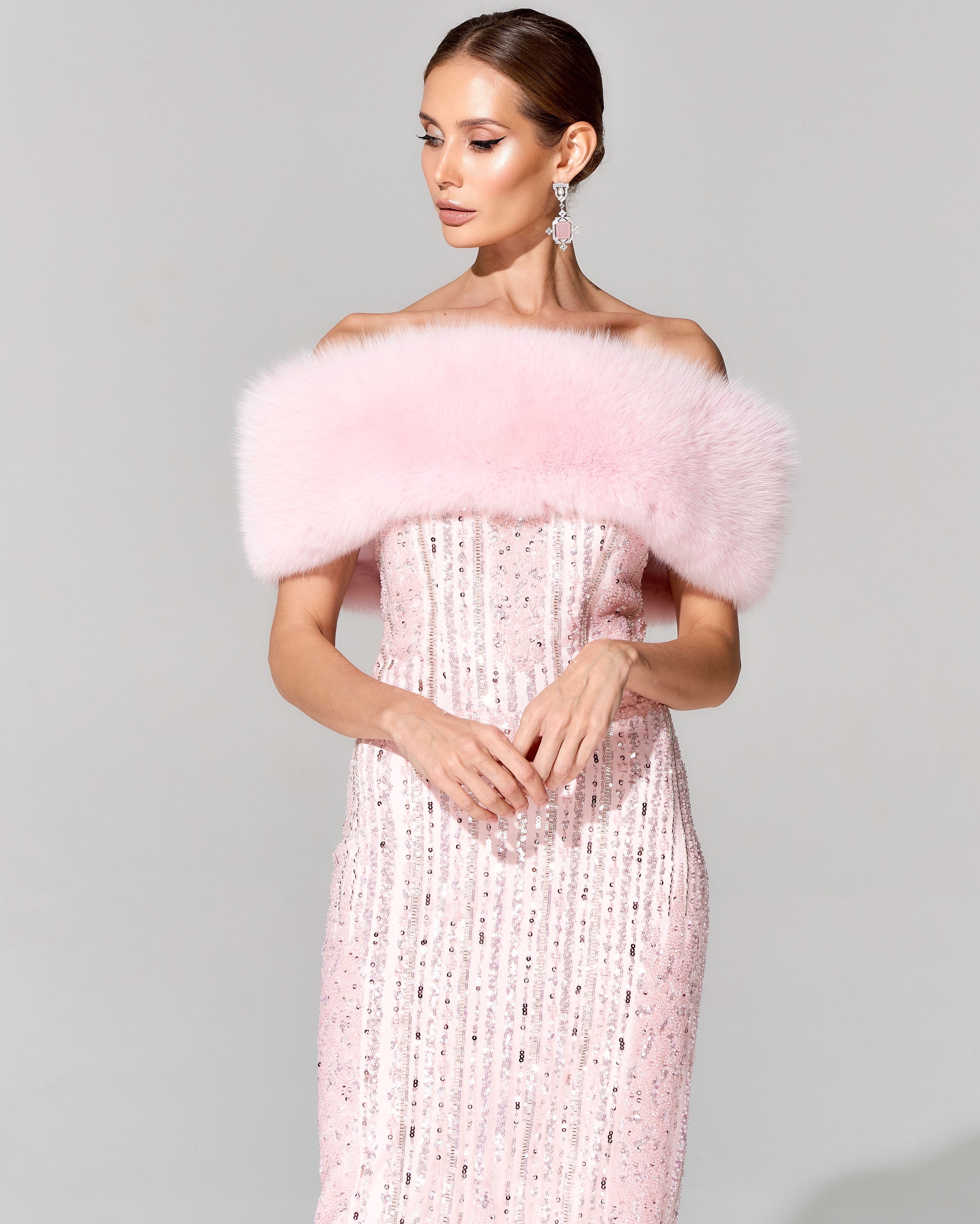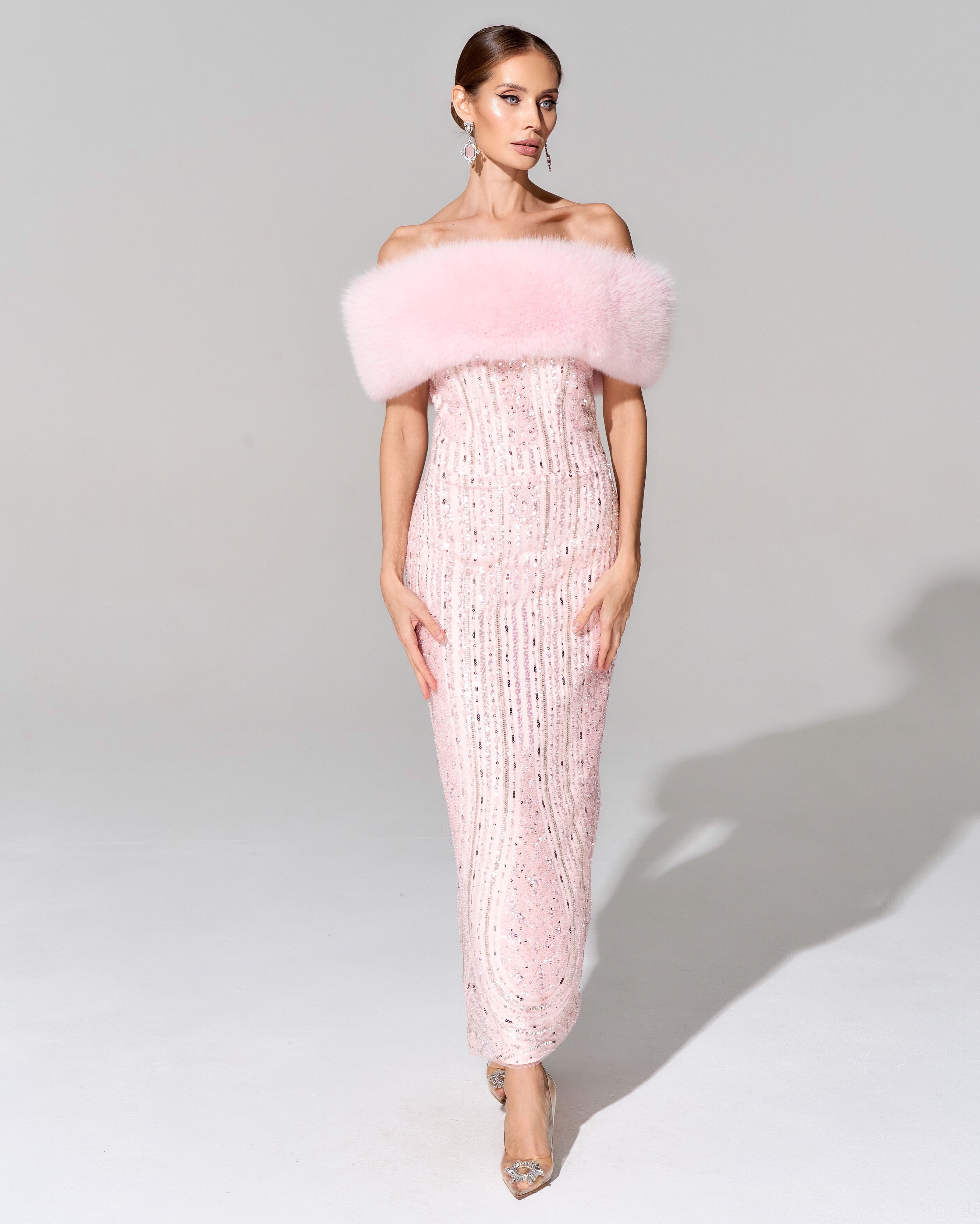 Корсетное платье с вышивкой ручной работы и меховой отделкой