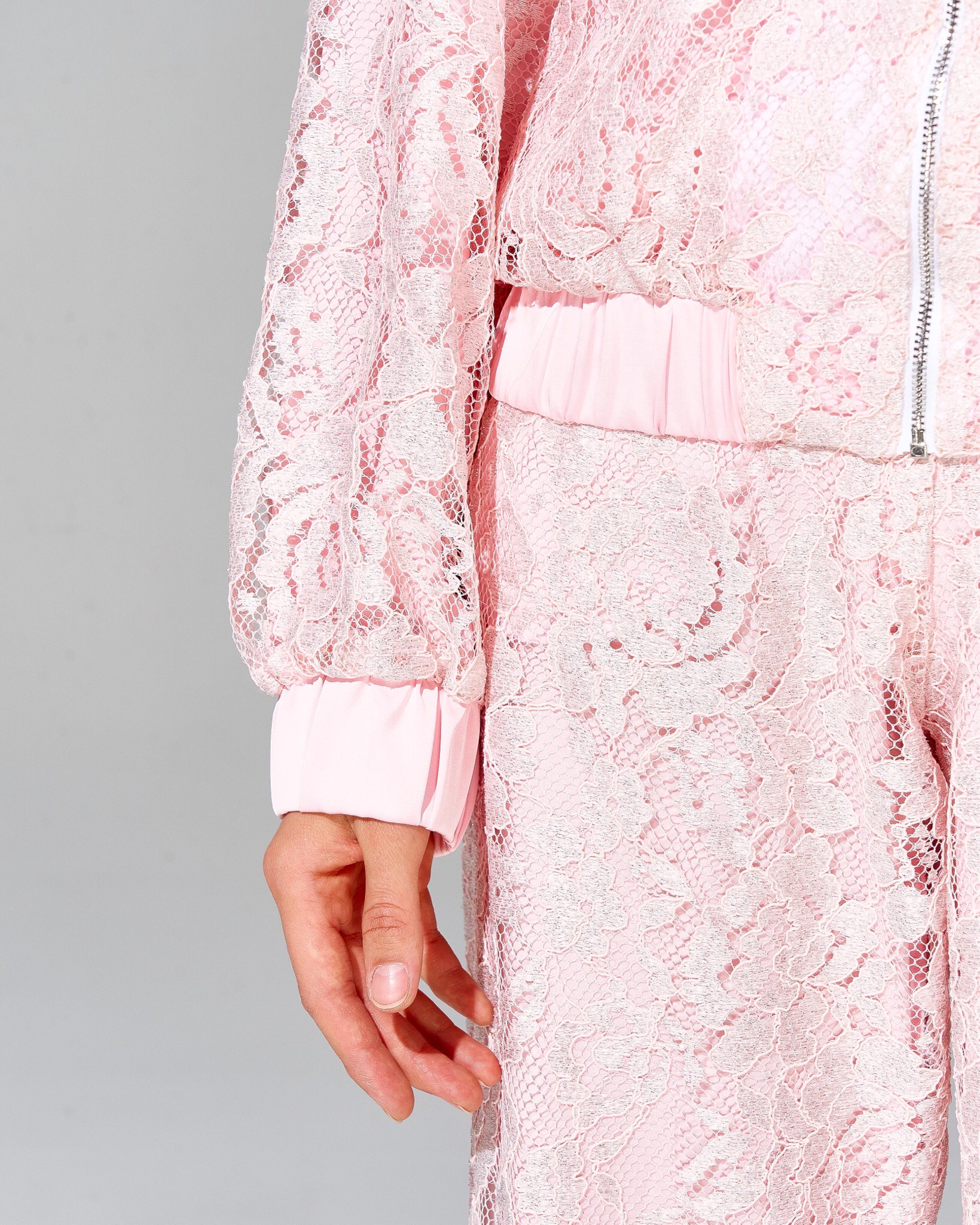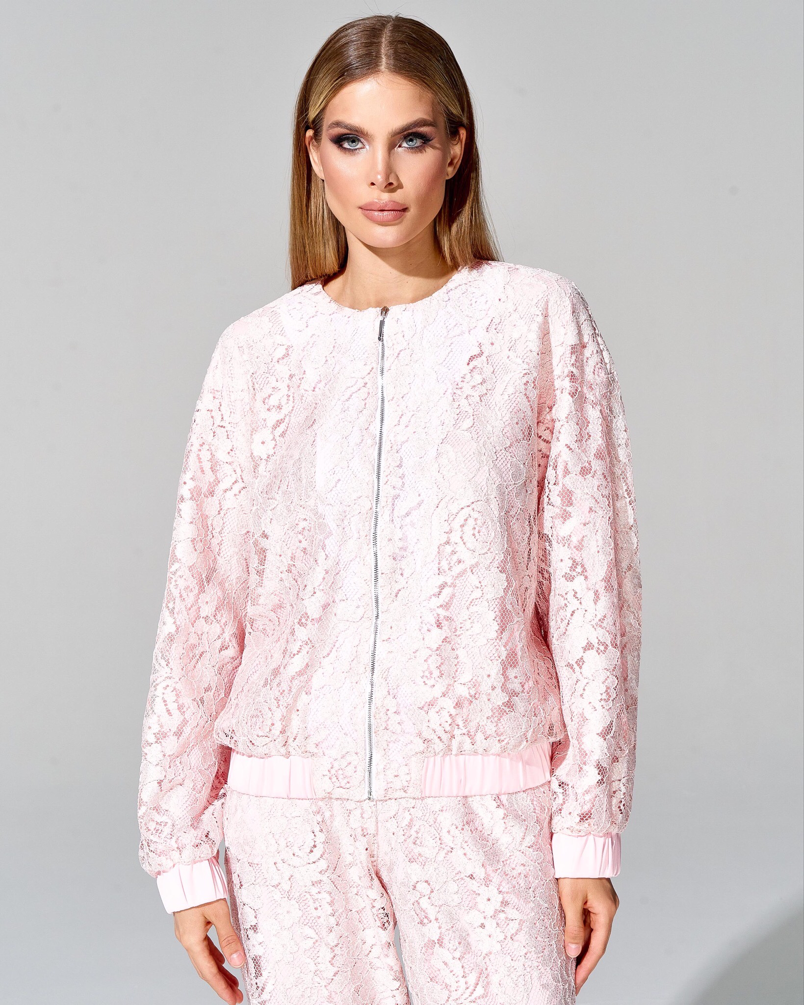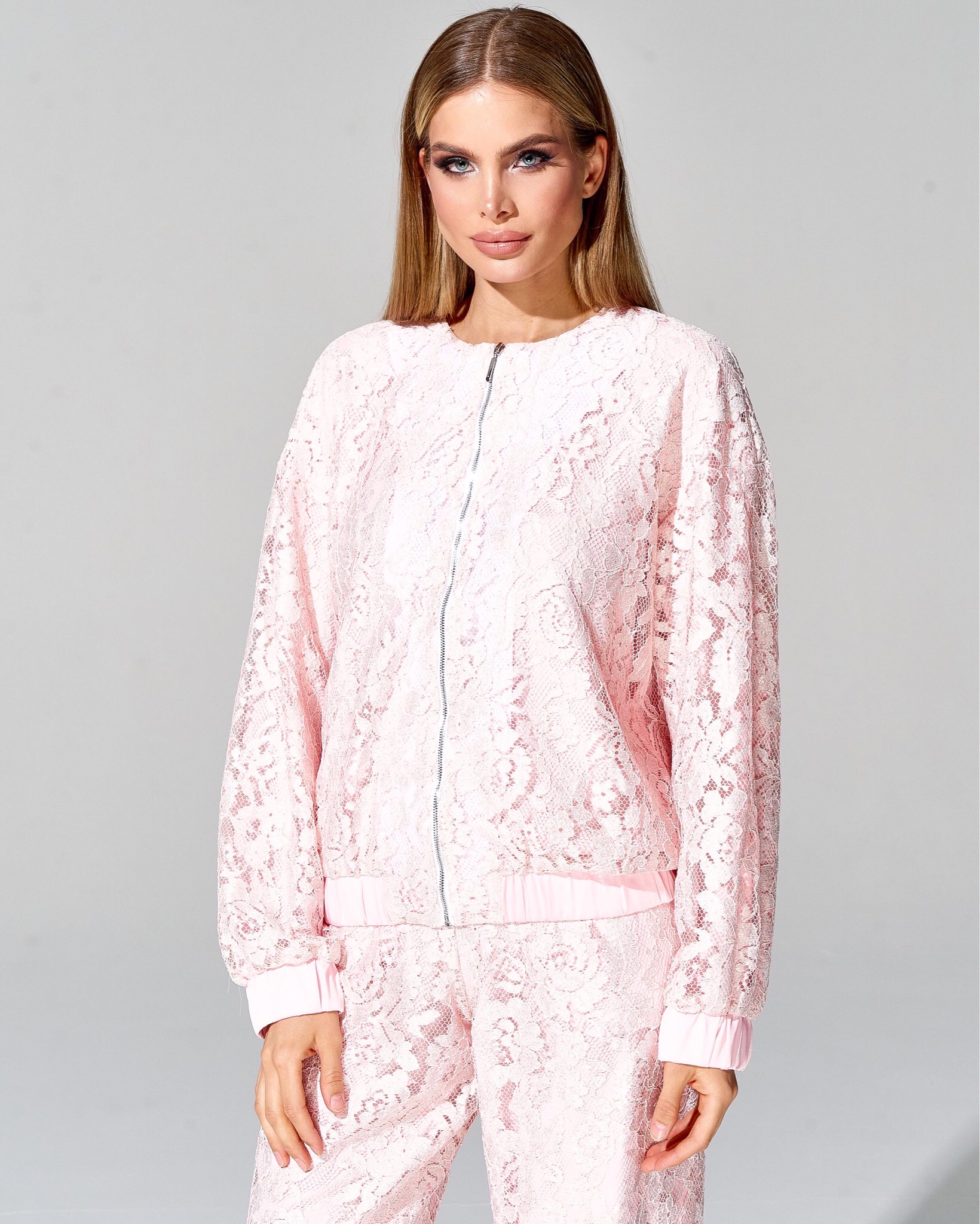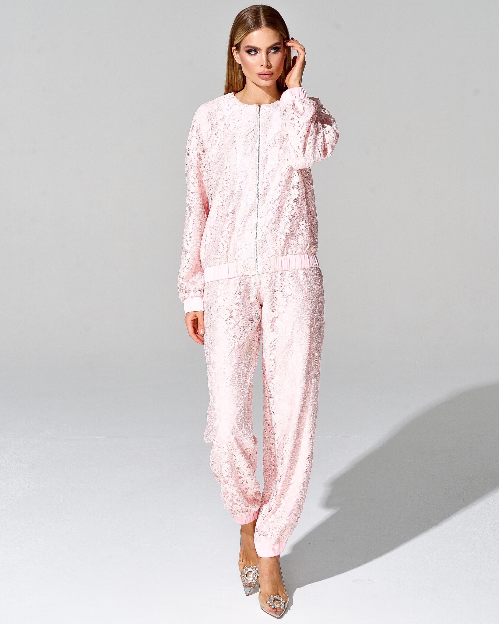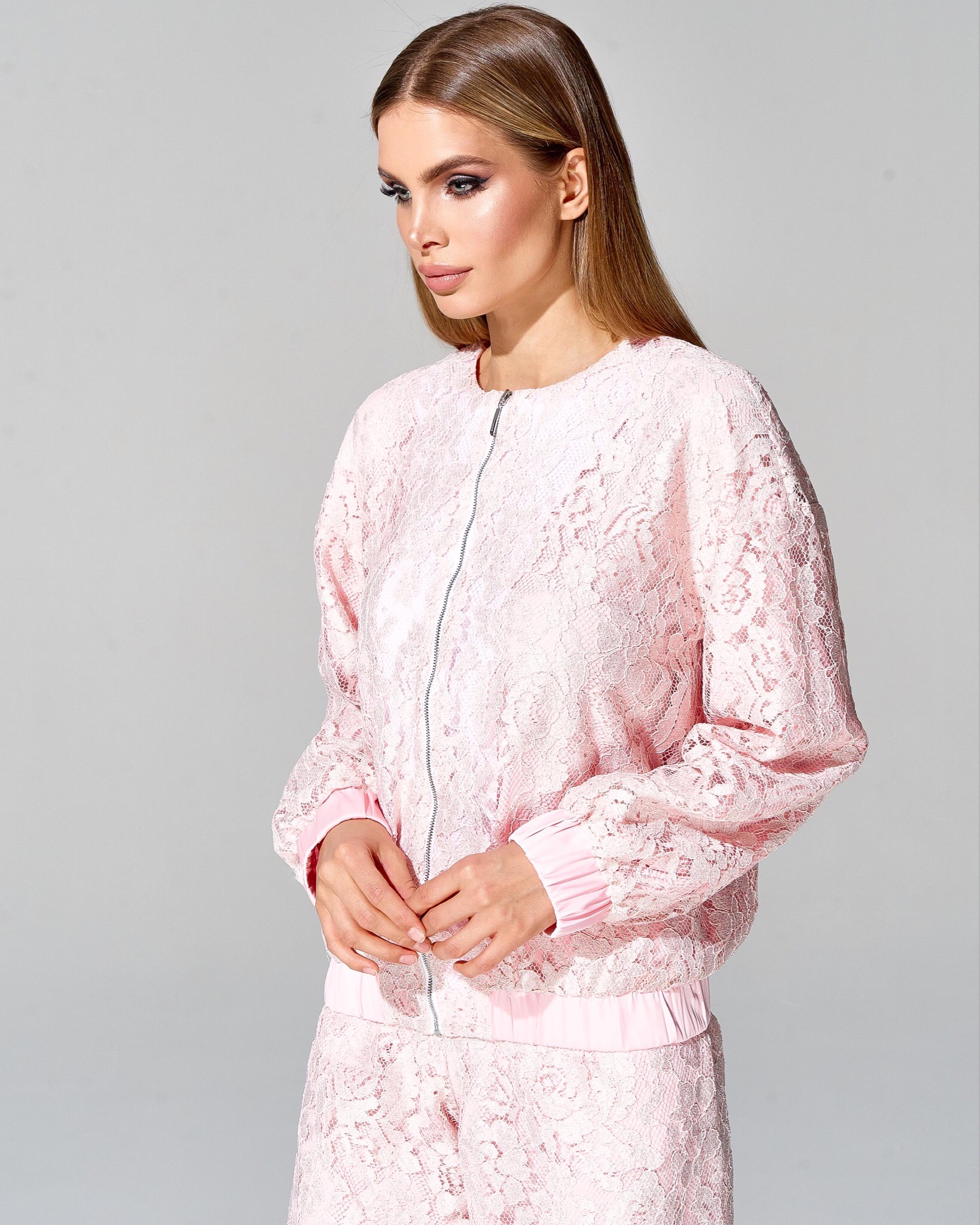 Костюм выполнен из премиального кружева. Манжеты и пояс выполнены из шелковистой ткани. Эластичный пояс не сковывает движения и помогает сохранить комфорт в течении всего дня. Костюм станет идеальным решением для создания женственного, но при этом удобного образа на каждый день.