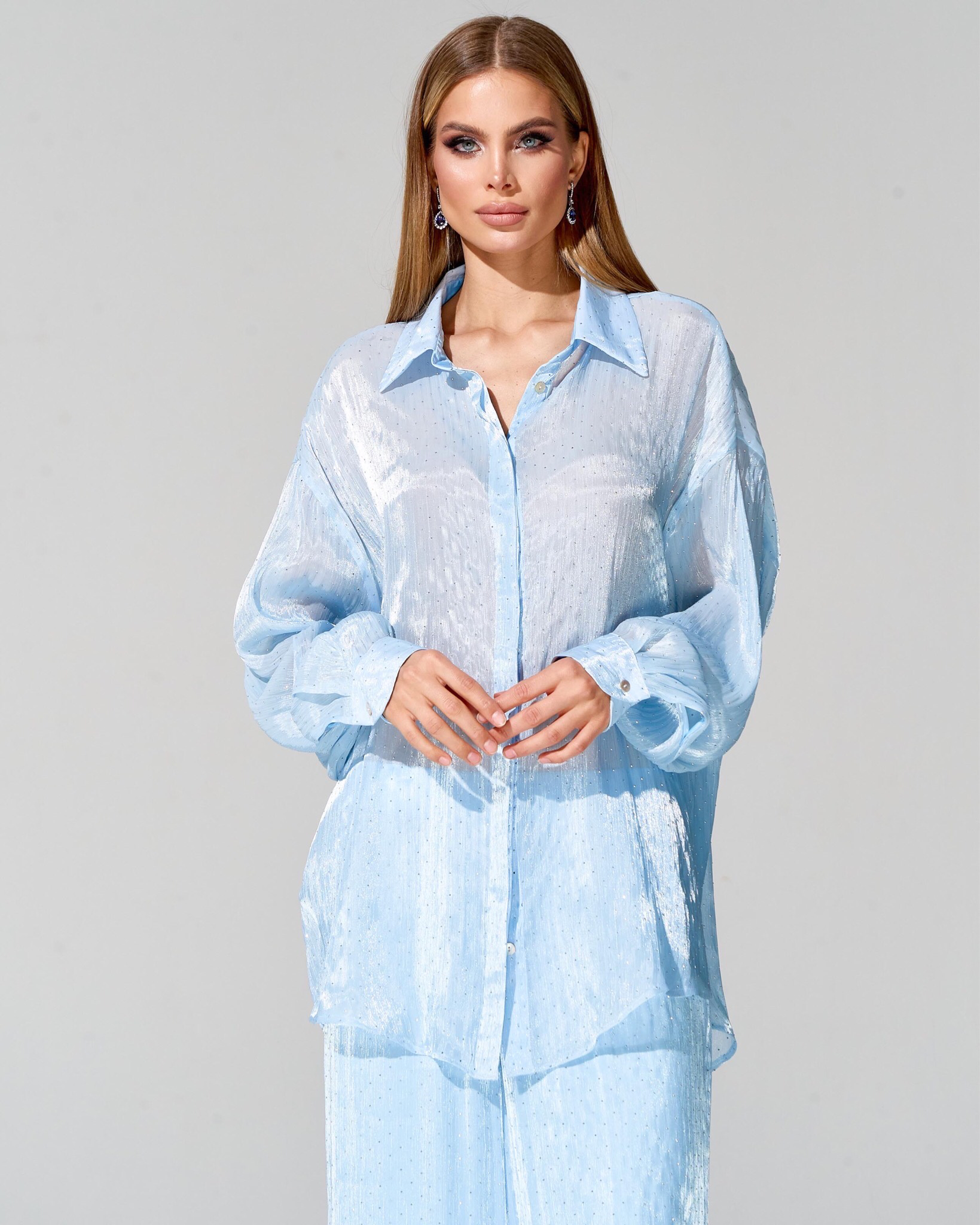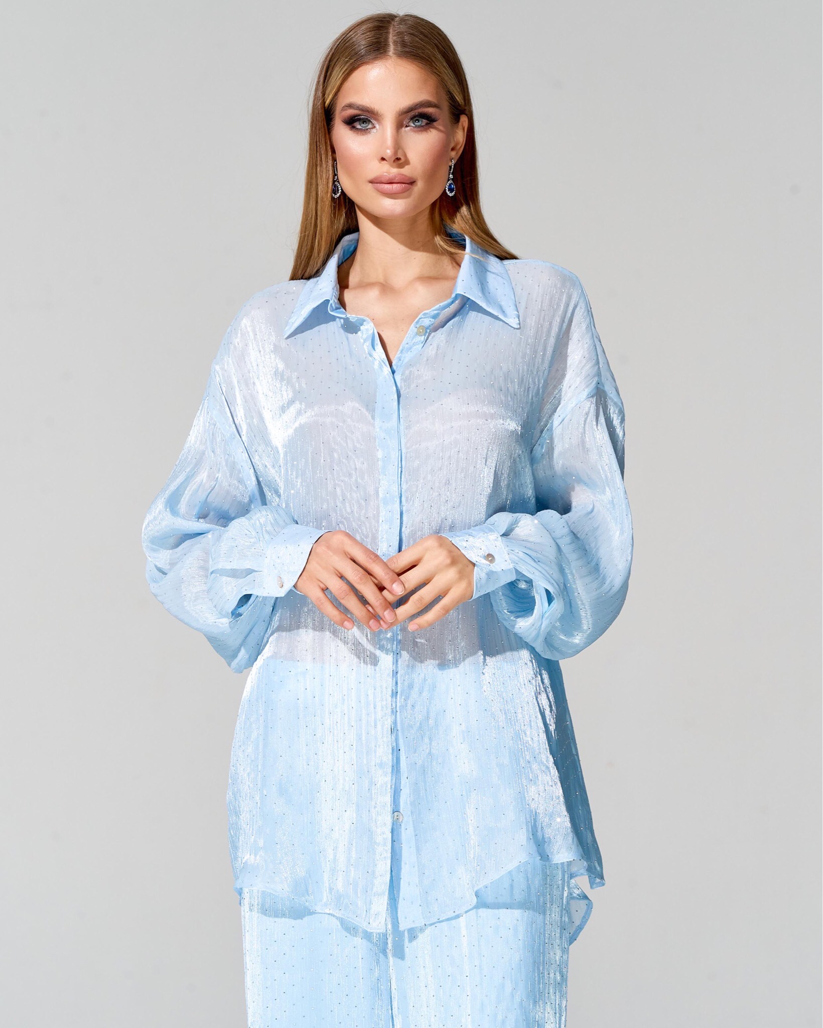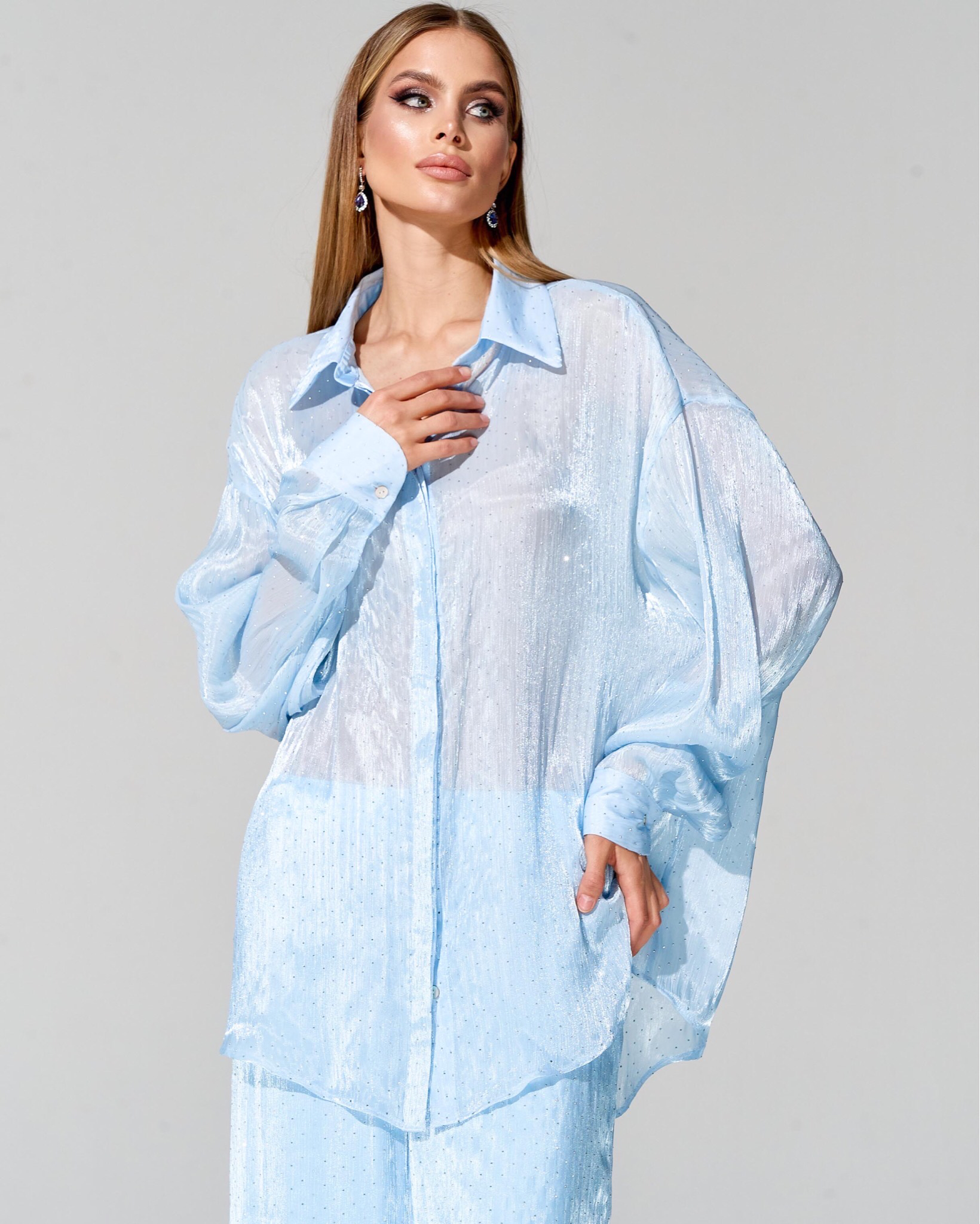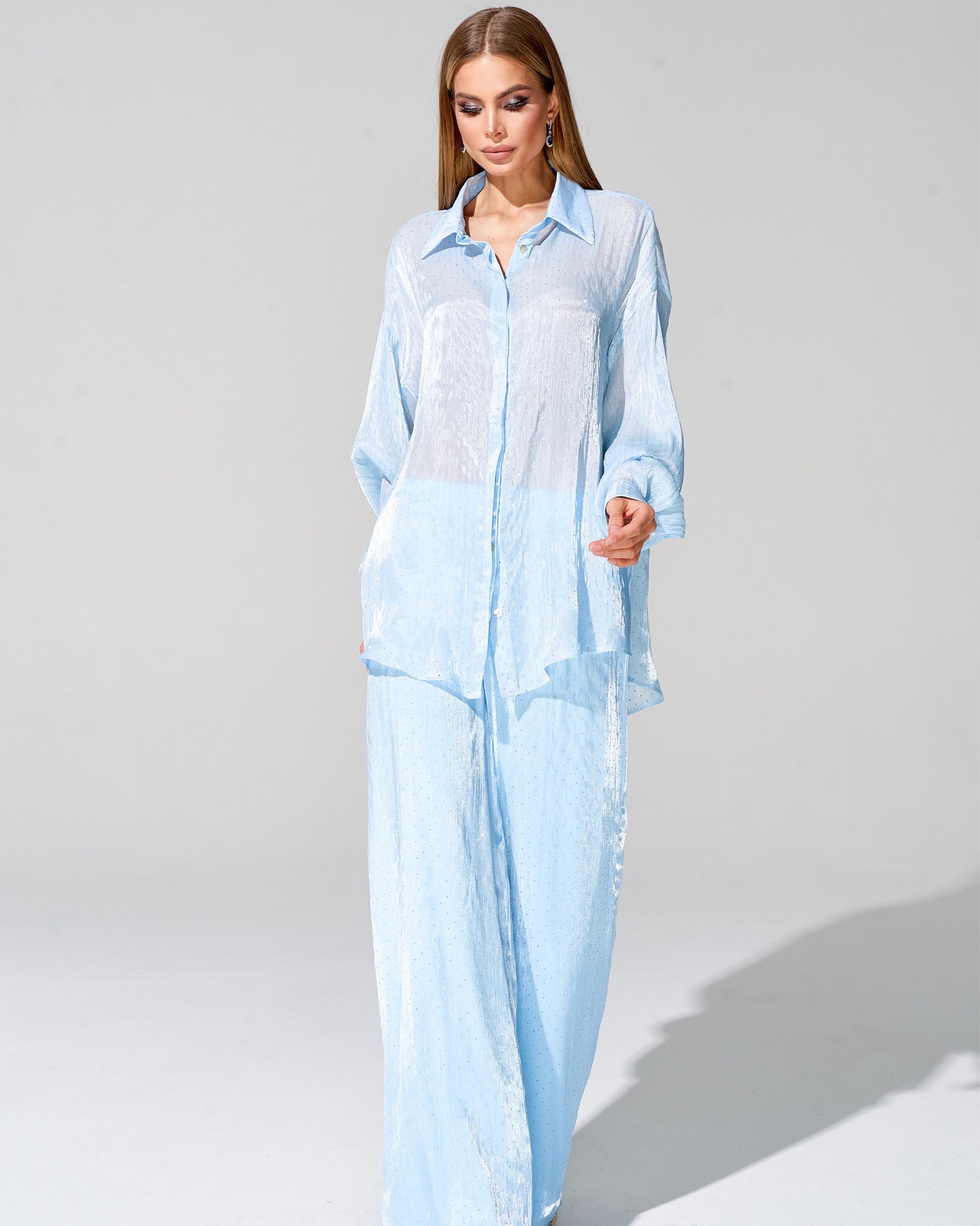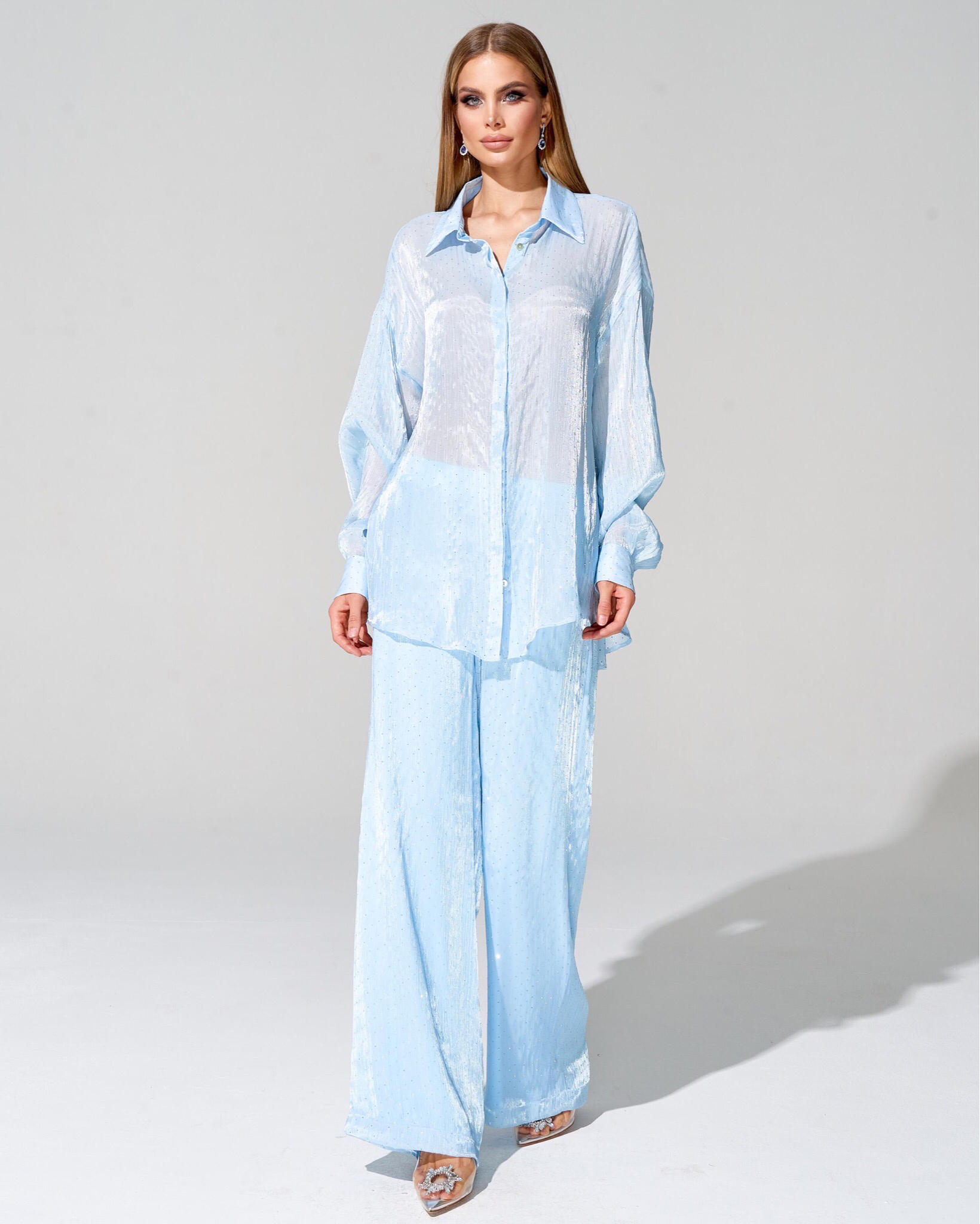 Костюм выполнен из премиальной шелковистой ткани, на которую вручную нанесены кристаллы Swarovski. Мерцание кристаллов завораживает своей красотой и никого не оставит равнодушным. Брюки визуально вытягивают силуэт и помогают сохранить правильные пропорции тела. Эластичный пояс не сковывает движения и помогает сохранить комфорт в течении всего дня. Рубашка свободного кроя составит прекрасную компанию любому образу и точно станет самой любимой в вашем гардеробе.