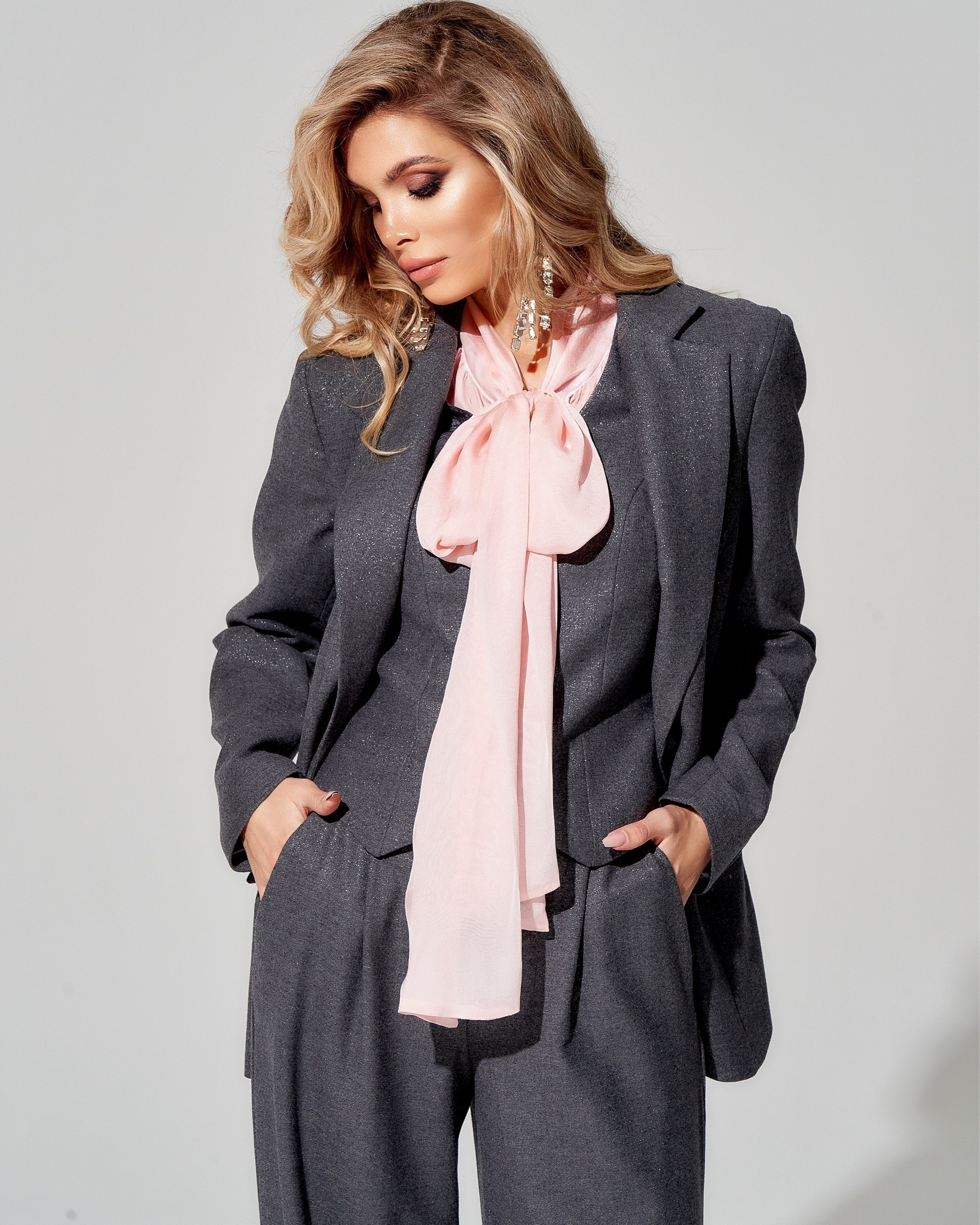Приталенный жакет выполнен из премиальной костюмной ткани из шерсти с шелком. Крой жакета подчёркивает достоинства фигуры и скрывает недостатки. Вертикальные линии вытягивают силуэт и сохраняют правильные пропорции.